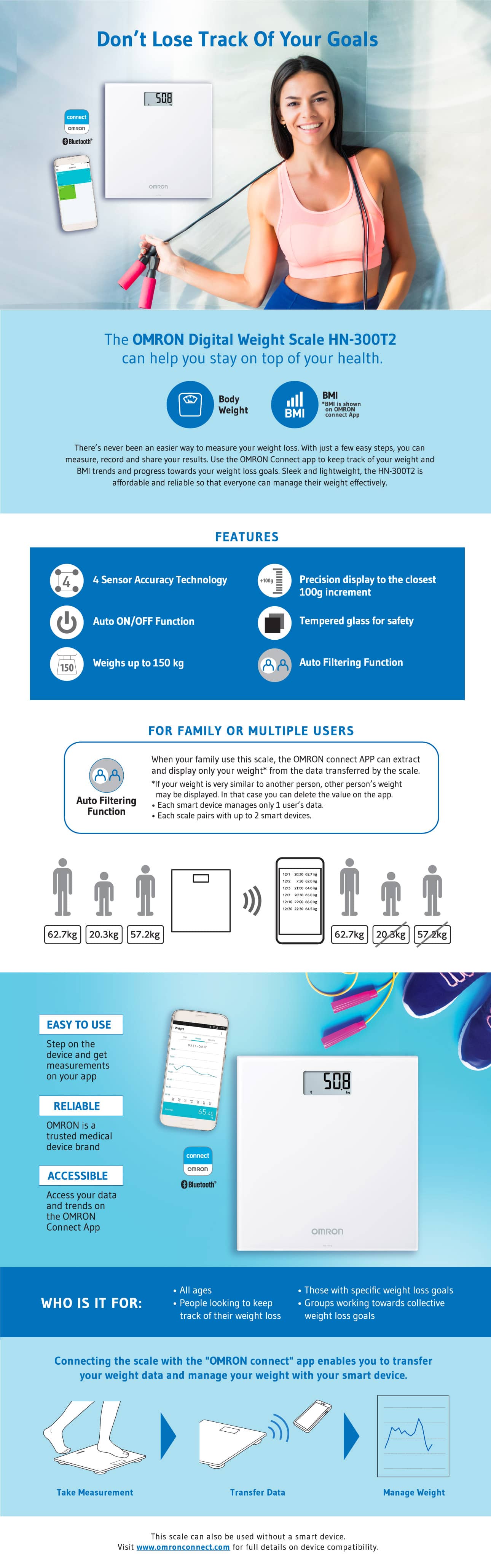 | A simple and accurate weight and BMI weighing scale, transfer your readings effortlessly with Bluetooth connection to the Omron connect App for your family (two-users). | ||||||||