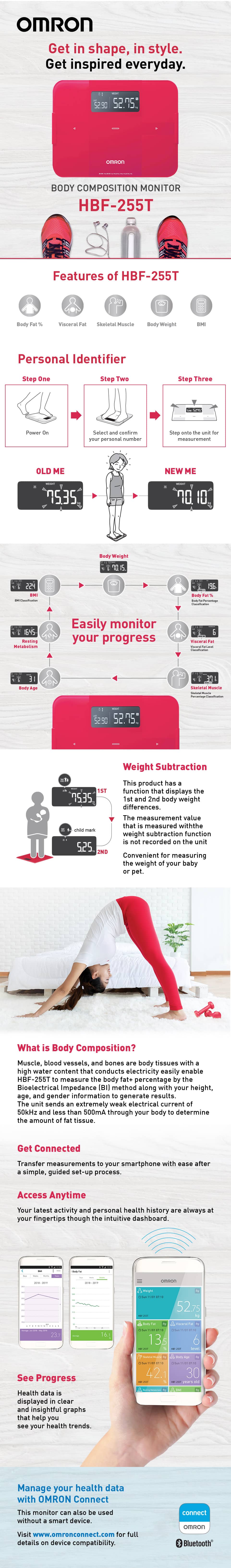 | Stylish Design for your home. Precise up to 50g and Previous value display function, you can have detailed track of your progress on both the device and the Omron connect App. Weight subtraction function makes it easy to weigh your baby or pet. | ||||||||